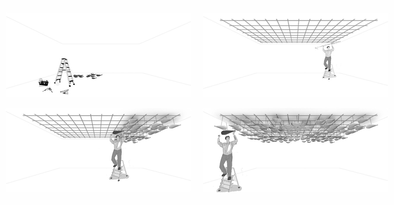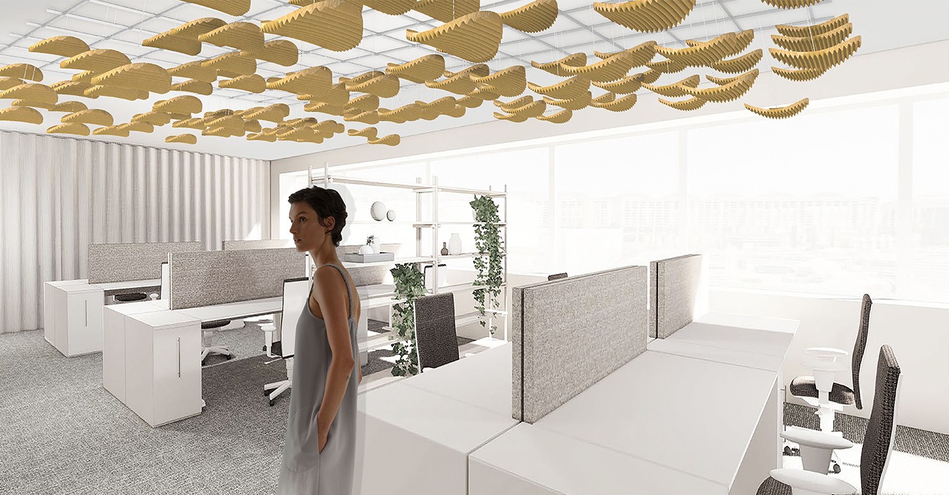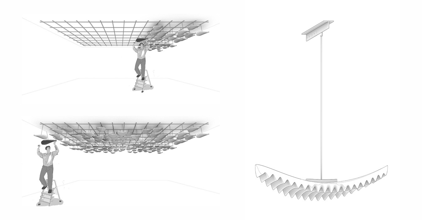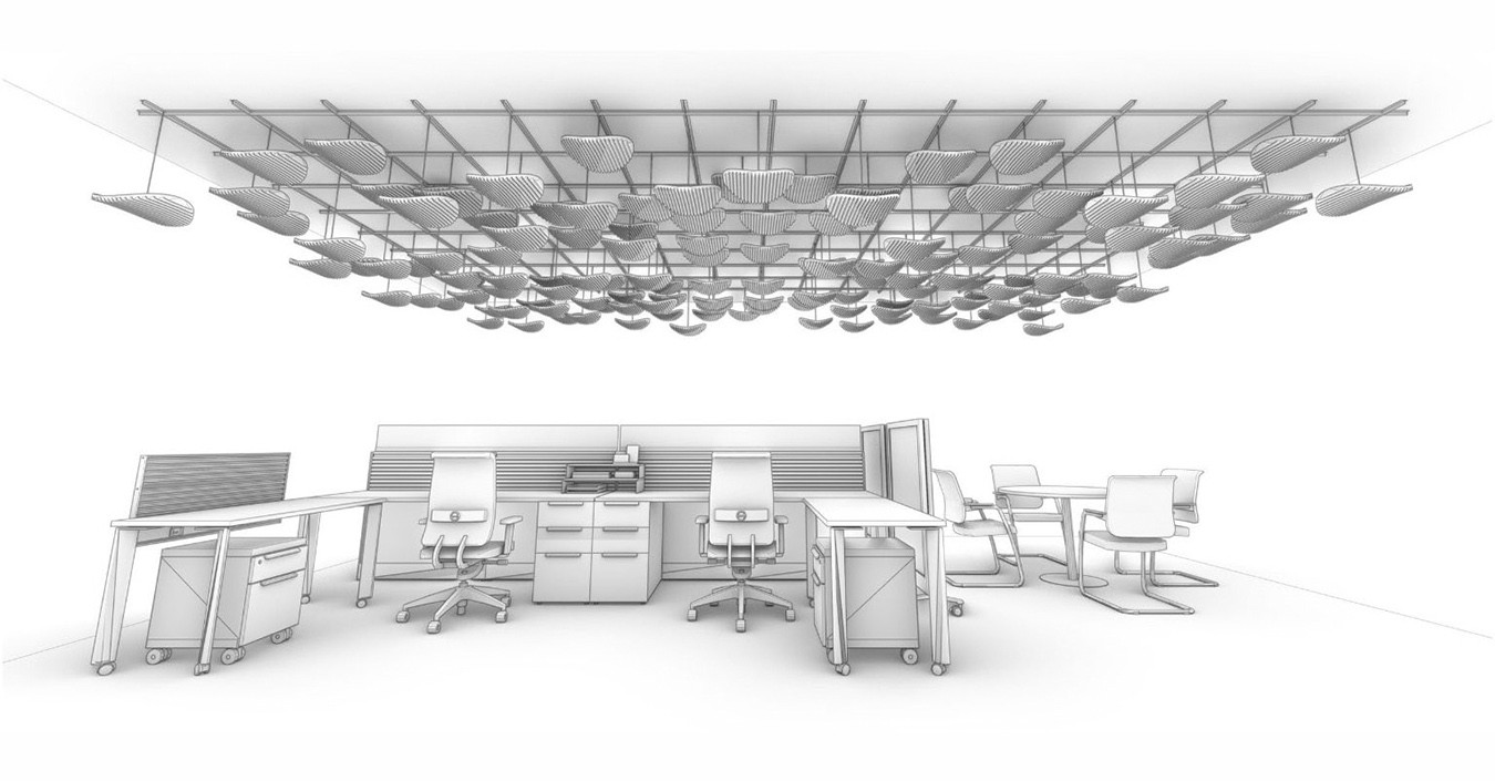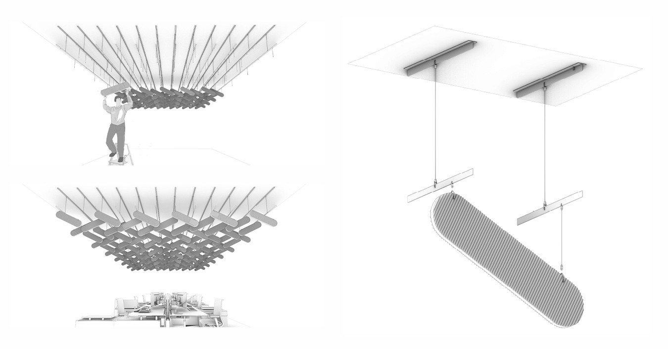 Cette démarche a donné naissance à trois premiers objets acoustiques (un baffle et deux modules dits "chips"), puis à trois îlots acoustiques suspendus associant efficacité, esthétique et sobriété : Arc en Cel, Nuages TER-CEL 1 & 2. Ces éléments tirent parti de la texture du matériau pour diffuser et adoucir le son dans l’espace, tout en s’intégrant élégamment à l’environnement intérieur.